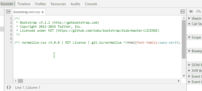 有很多css/js的代码都会被 minify 掉,你可以点击代码窗口左下角的那个 { } 标签,chrome会帮你给格式化掉。