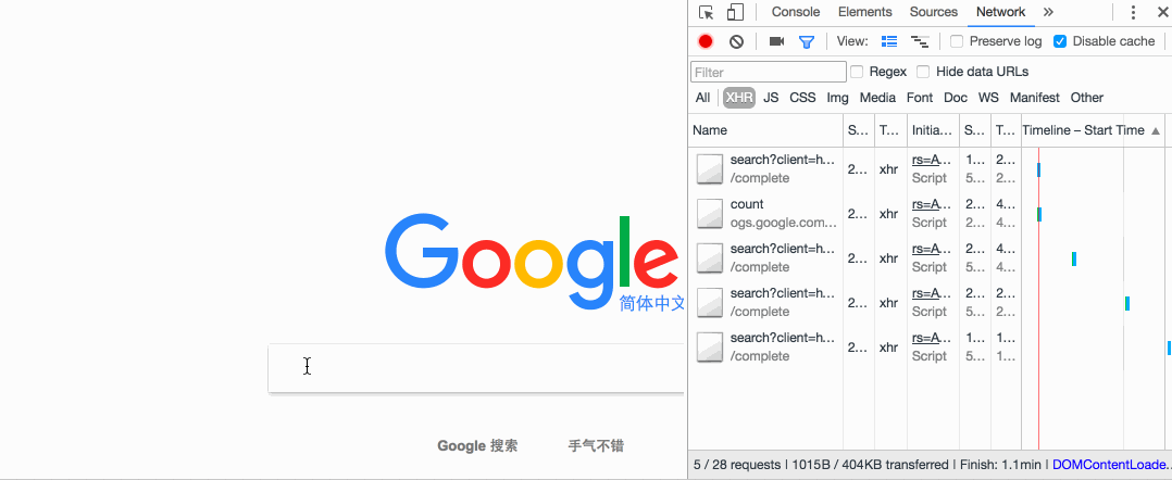 这个是我很喜欢 的一个功能,你可以在network选项卡里,点击 XHR 过滤相关的Ajax请求,然后在相关的请求上点鼠标右键,在菜单中选择: Copy => Copy as cURL ,然后就可以到你的命令行下去 执行 curl 的命令了。这个可以很容易做一些自动化的测试。