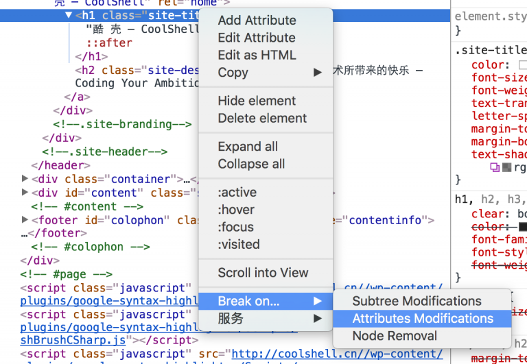 选中一个DOM,然后在右键菜单中选 Break on … 你可以看到如下三个选项: