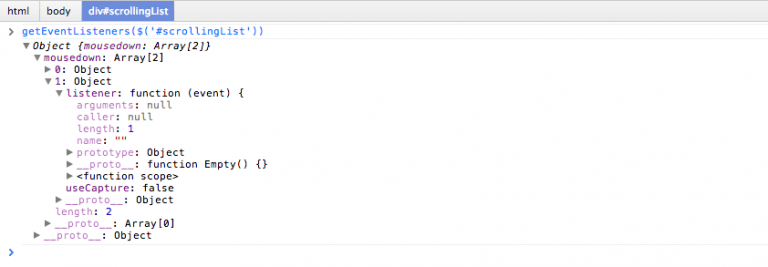 你还可以使用 monitorEvents($("selector")) 来监控相关的事件。比如:monitorEvents(document.body, "click");