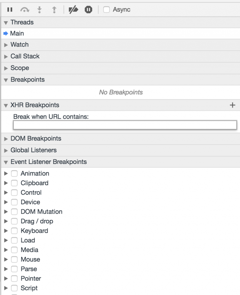 在 Sources 面页中,你可以看到右边的那堆break points中,除了上面我们说的给DOM设置断点,你还可以给XHR和Event Listener设置断点,载图如下: