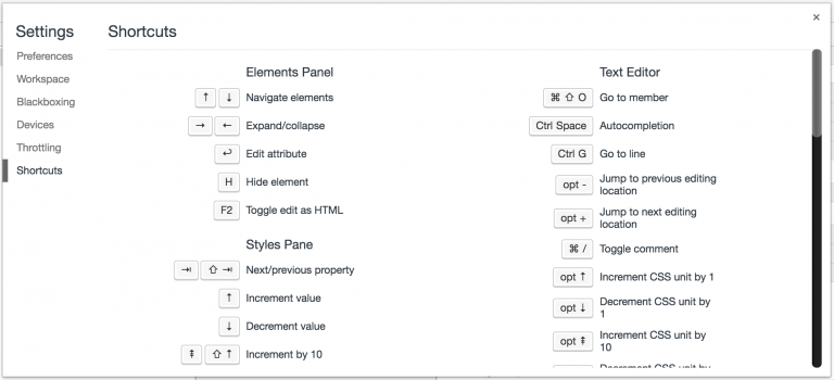 点击在 DevTools的右上角的那三个坚排的小点,你会看到一个菜单,点选 Shortcuts ,你就可以看到所有的快捷键了