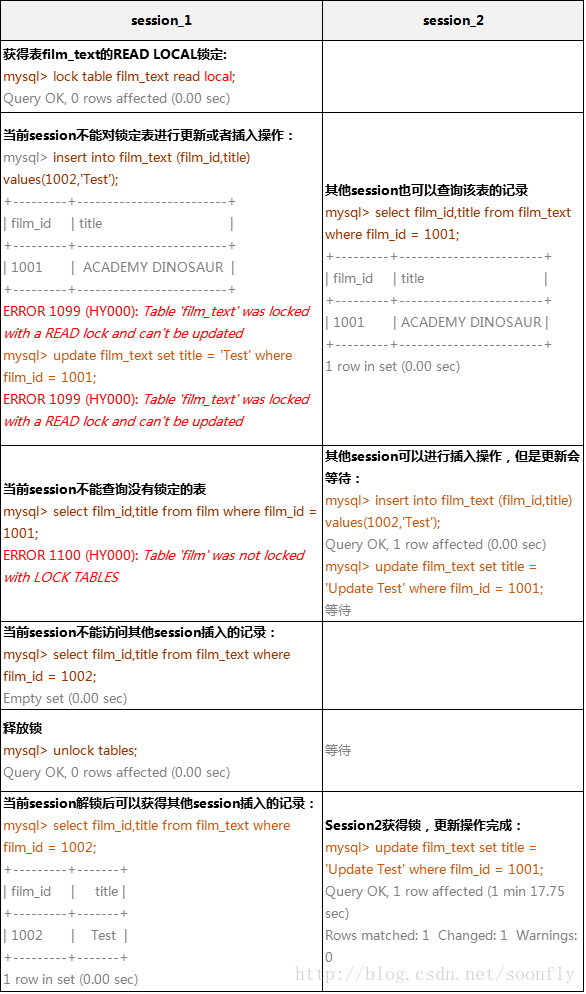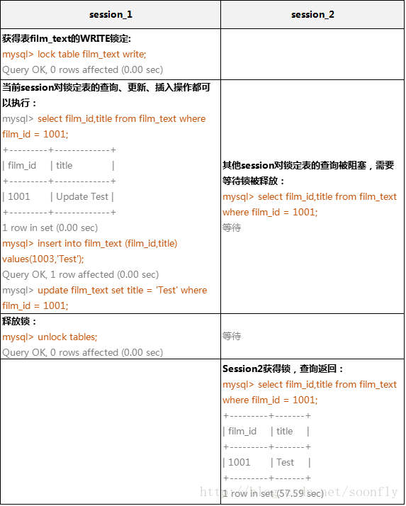 一个session使用LOCK TABLE命令给表film_text加了读锁,这个session可以查询锁定表中的记录,但更新或访问其他表都会提示错误;同时,另外一个session可以查询表中的记录,但更新就会出现锁等待。