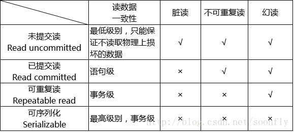 为了解决“隔离”与“并发”的矛盾,ISO/ANSI SQL92定义了4个事务隔离级别,每个级别的隔离程度不同,允许出现的副作用也不同,应用可以根据自己的业务逻辑要求,通过选择不同的隔离级别来平衡 “隔离”与“并发”的矛盾。下表很好地概括了这4个隔离级别的特性。