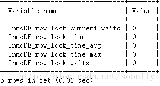 可以通过检查InnoDB_row_lock状态变量来分析系统上的行锁的争夺情况: