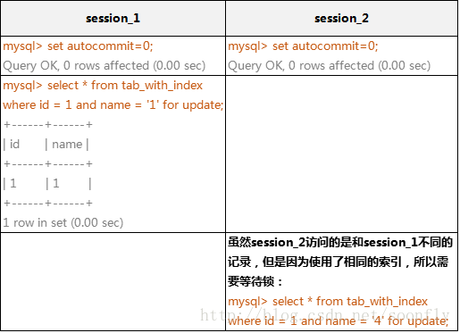 在上面的例子中,看起来session_1只给一行加了排他锁,但session_2在请求其他行的排他锁时,却出现了锁等待!原因就是在没有索引的情况下,InnoDB只能使用表锁。当我们给其增加一个索引后,InnoDB就只锁定了符合条件的行,如下例所示: